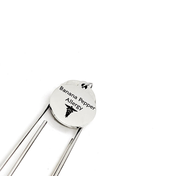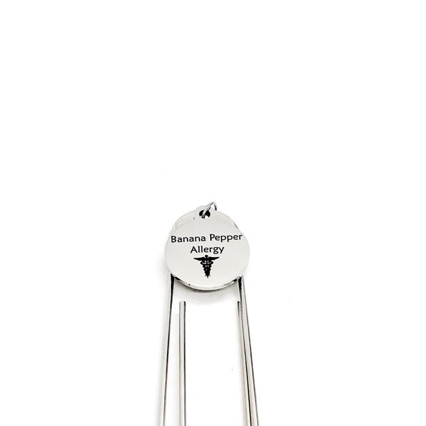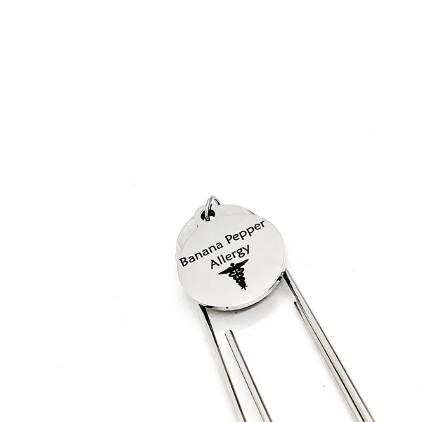 This bookmark has a stainless steel laser engraved charm that has “Banana Pepper Allergy” on it. The charm measures approx. 3/4 inch across.