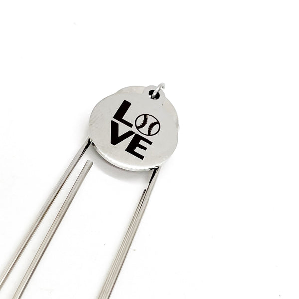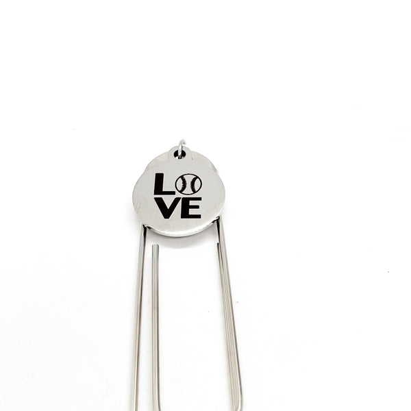 This is a great bookmark. This paper clip bookmark has a stainless steel laser engraved charm with “LOVE” with a baseball in the place of the O on it. It can be used as a bookmark, page marker, or planner book mark.