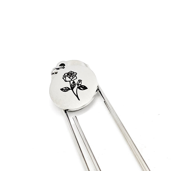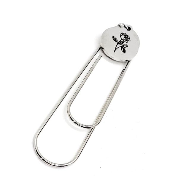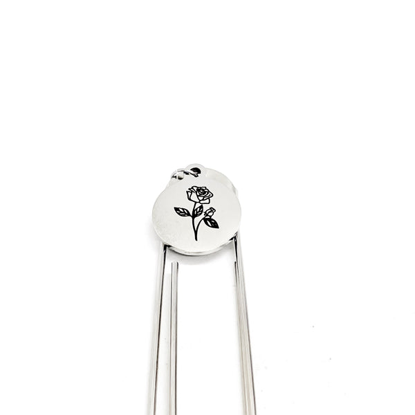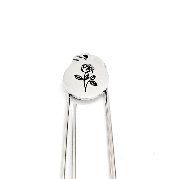 This bookmark has a stainless steel laser engraved charm that has a Rose the birth month flower for June on it. The charm measures approx. 3/4 inch across.