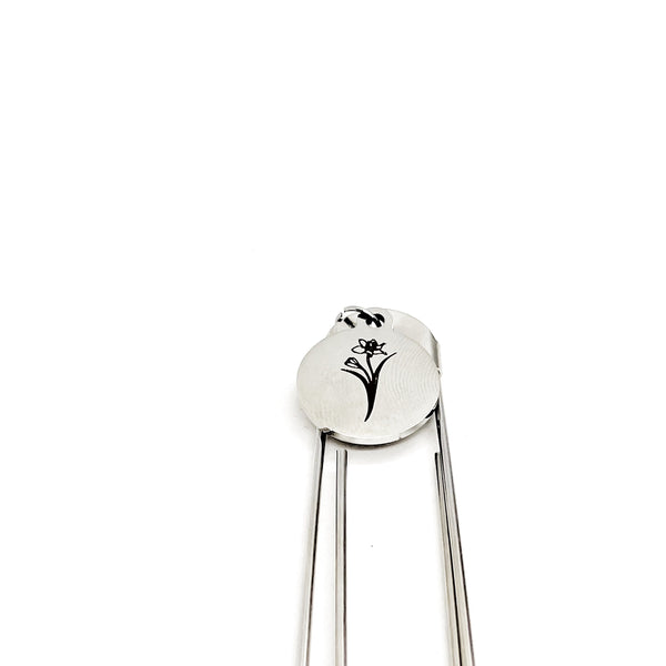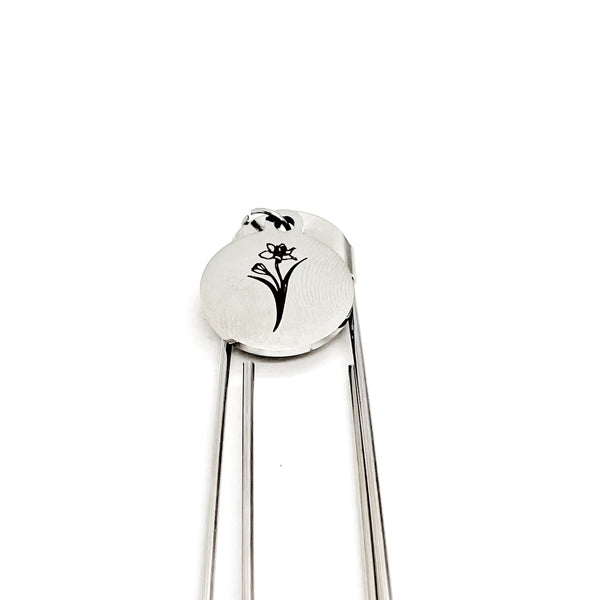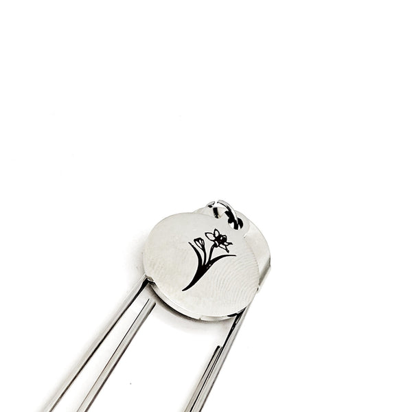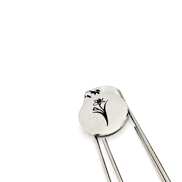This bookmark has a stainless steel laser engraved charm that has a daffodil, the birth month flower for March on it. The charm measures approx. 3/4 inch across.