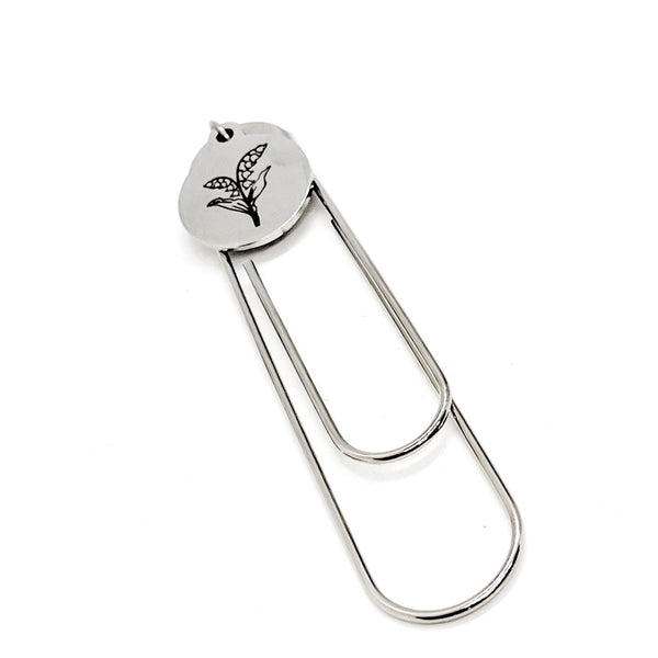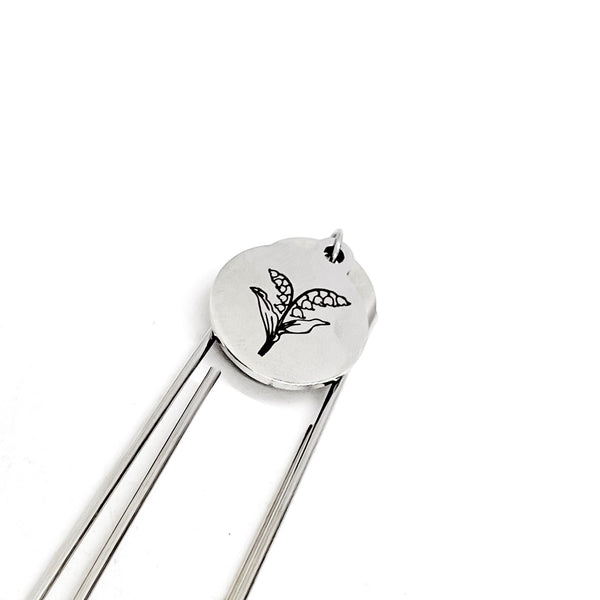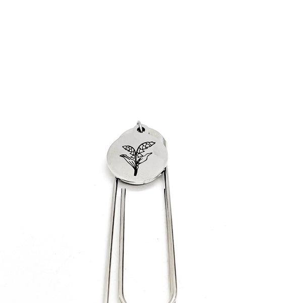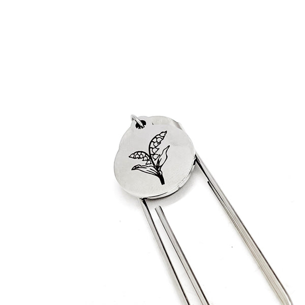 This bookmark has a stainless steel laser engraved charm that has a Lily of the valley the birth month flower for May on it. The charm measures approx. 3/4 inch across.