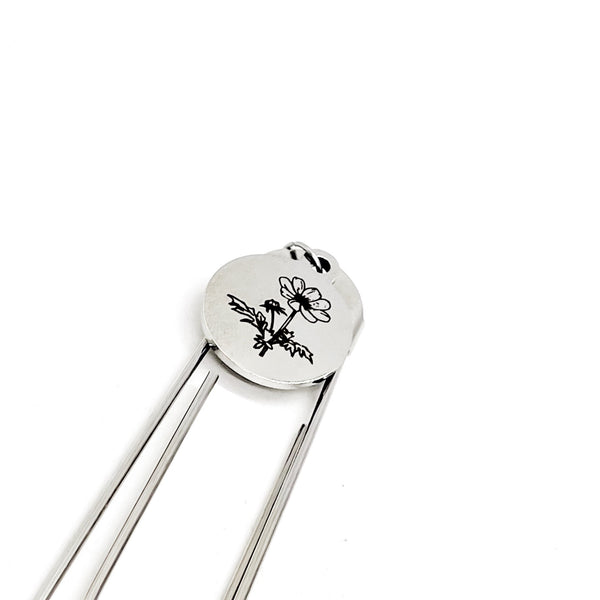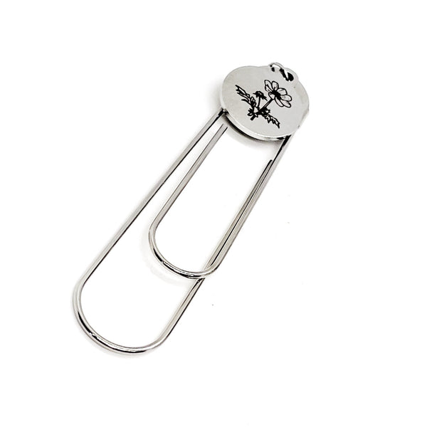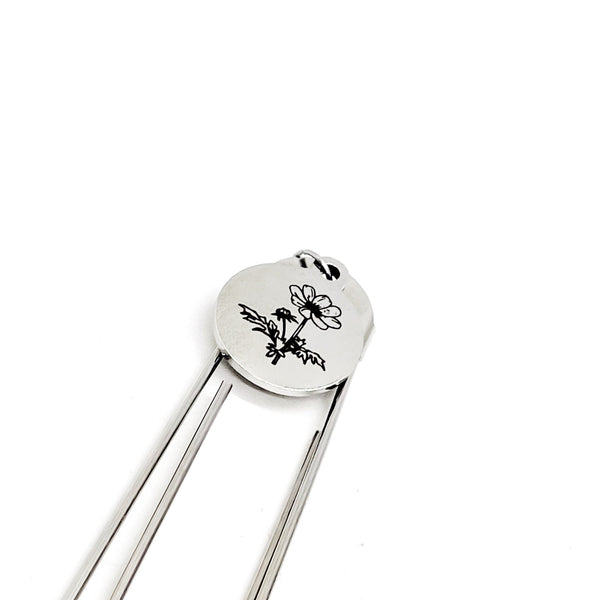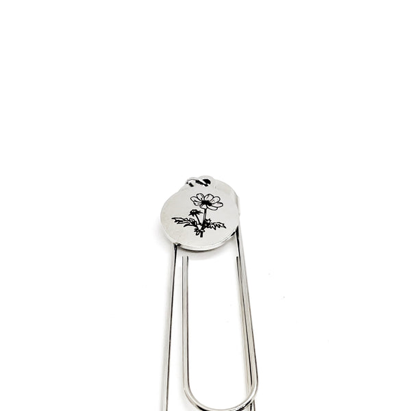 This bookmark has a stainless steel laser engraved charm that has a Cosmos the birth month flower for October on it. The charm measures approx. 3/4 inch across.