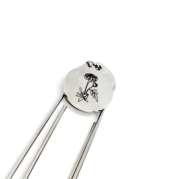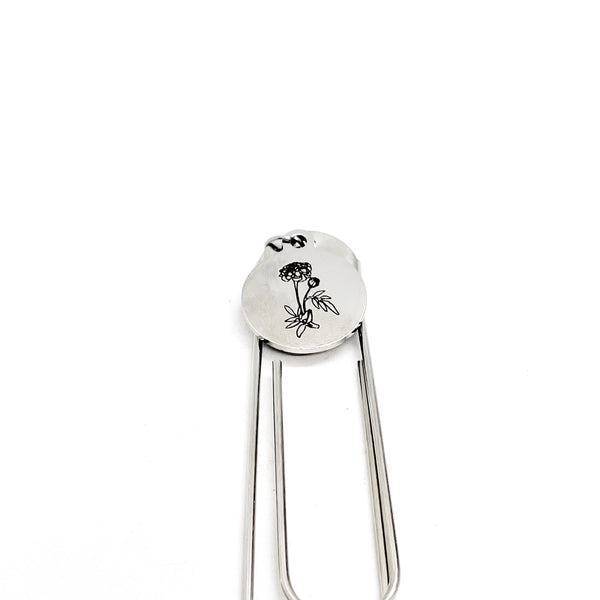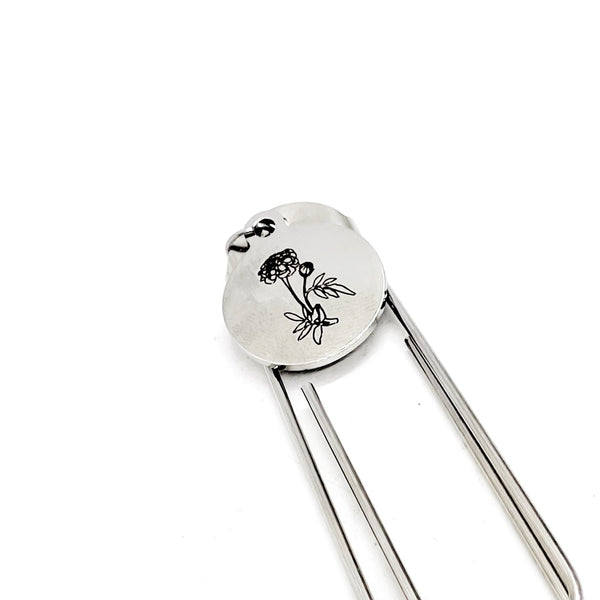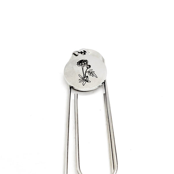 This bookmark has a stainless steel laser engraved charm that has a marigold, the birth month flower for October on it. The charm measures approx. 3/4 inch across.