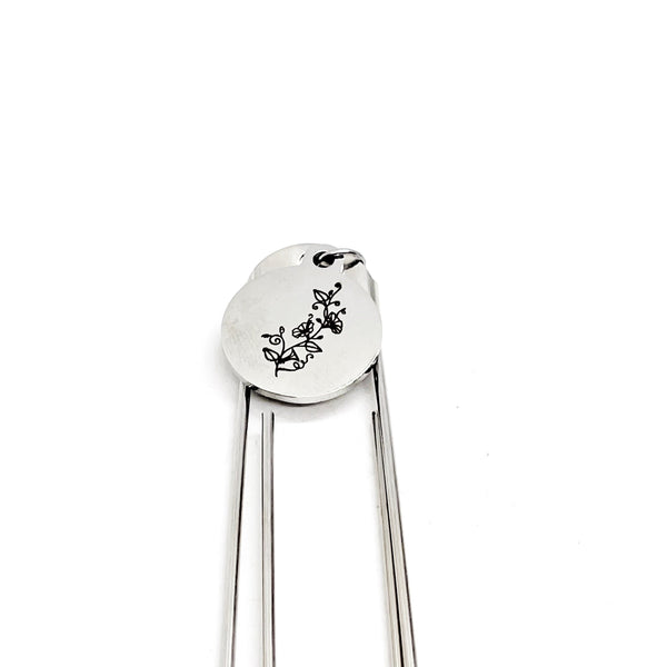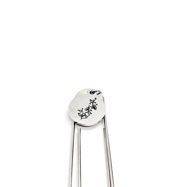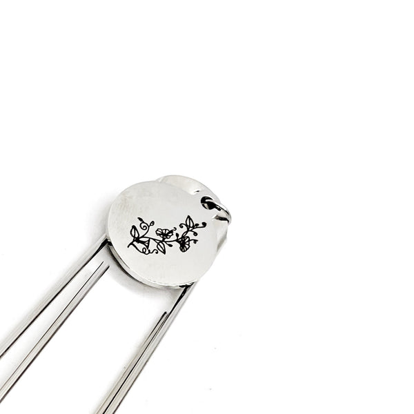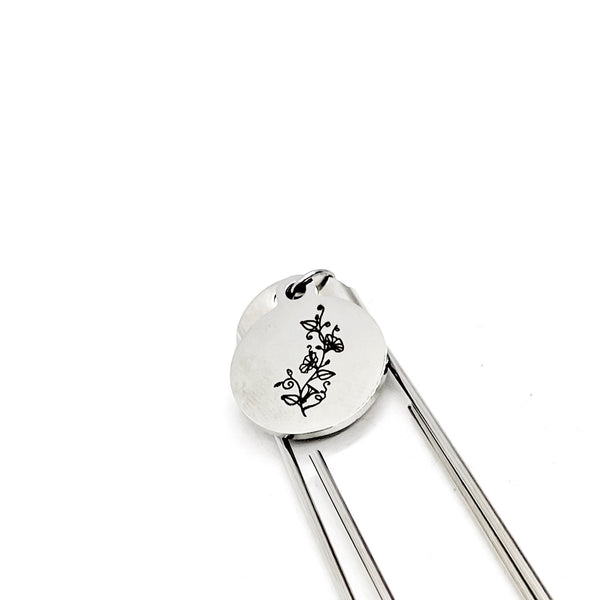 This bookmark has a stainless steel laser engraved charm that has a morning glory, the birth month flower for September on it. The charm measures approx. 3/4 inch across.