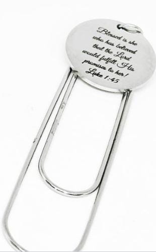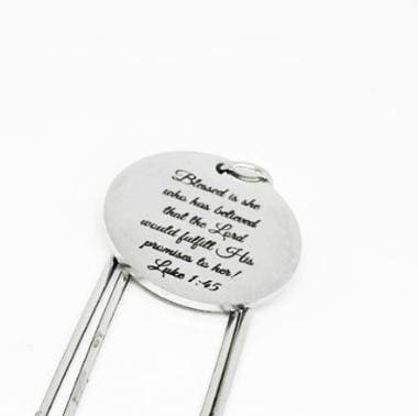 Keep your place in faith-filled style with this inspirational stainless steel paperclip bookmark from JKCE Designs. Featuring a beautifully engraved charm that reads, “Blessed is she who has believed that the Lord would fulfill His promises to her. Luke 1:45,” this bookmark is the perfect reminder of trust and hope. The charm measures approximately 25mm and is securely attached to a durable 3 1/2 inch silver paperclip—ideal for marking your favorite Bible verse or devotional passage. A thoughtful Christian gift for women, Bible study groups, or anyone who treasures faith and encouragement.