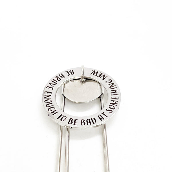 This is a great large paper clip style bookmark that has a stainless steel laser engraved charm with “Be brave enough to be bad at something new” on it. It can be used as a bookmark, page marker, or planner book mark.