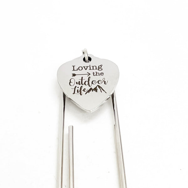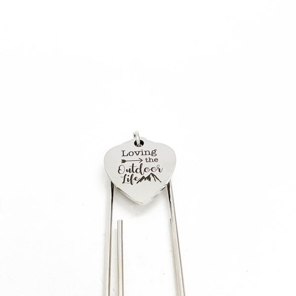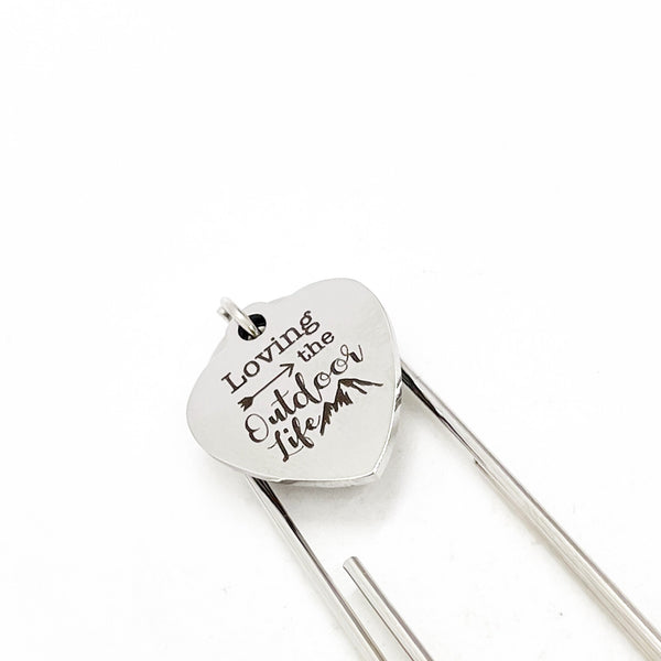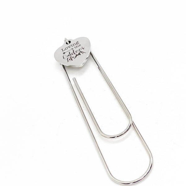 This is a great large paper clip style bookmark that has a stainless steel laser engraved charm with “Loving the Outdoor Life” on it. It can be used as a bookmark, page marker, or planner book mark.