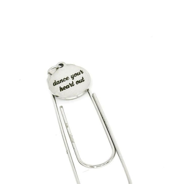 This oversized stainless steel paperclip bookmark features a 19mm engraved charm with the phrase “dance your heart out” in the exact clean script font shown in the photos. The durable steel design slides smoothly onto book pages without damaging them, making it both beautiful and functional.