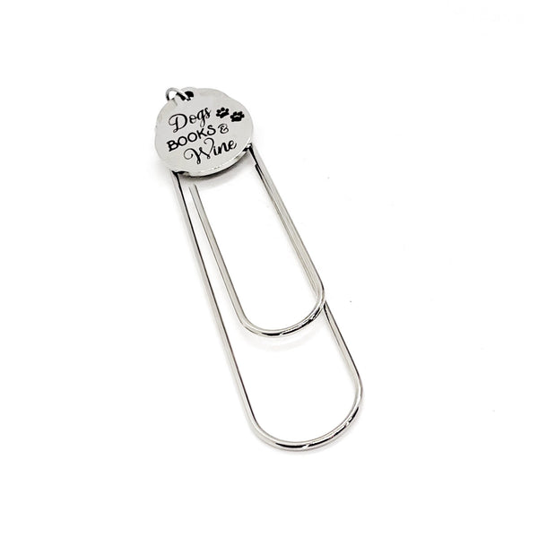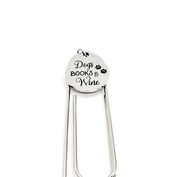 This bookmark has a stainless steel laser engraved charm that says “Dogs Books Wine The charm measures approx. 3/4 inch across.
