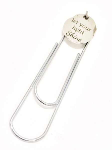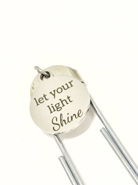 This is a great large paper clip style bookmark that has a stainless steel laser engraved charm with "Let your light shine" on it. It can be used as a bookmark, page marker, or planner book mark.