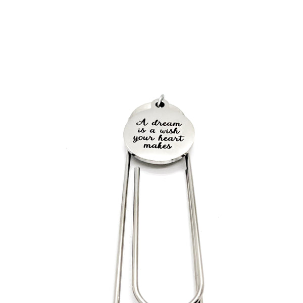 This bookmark has a stainless steel laser engraved charm with “A dream is a wish the heart makes” on it.