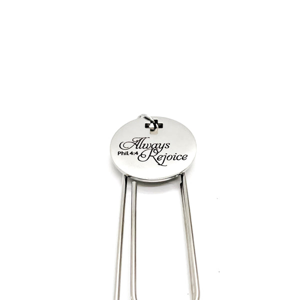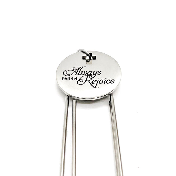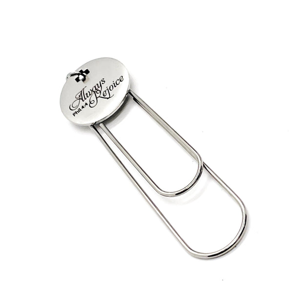 This bookmark has a stainless steel laser engraved charm with “Always Rejoice” from Philippians 4:4 on it.