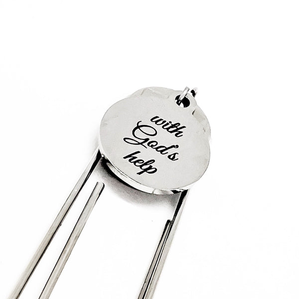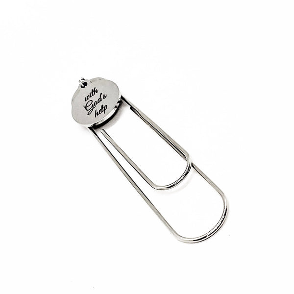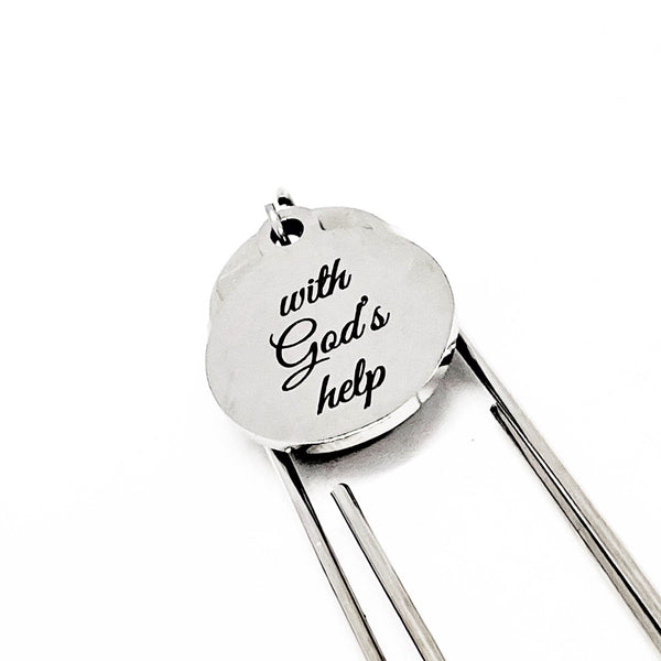 This bookmark has a stainless steel laser engraved charm with “with God’s help” on it.