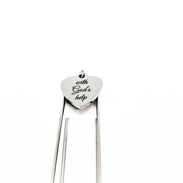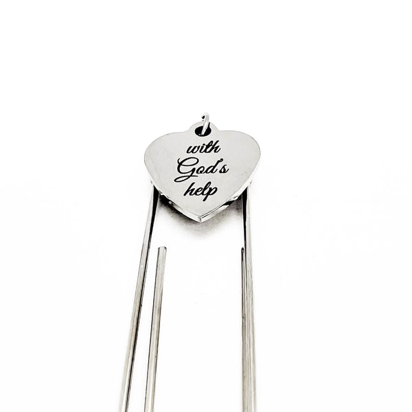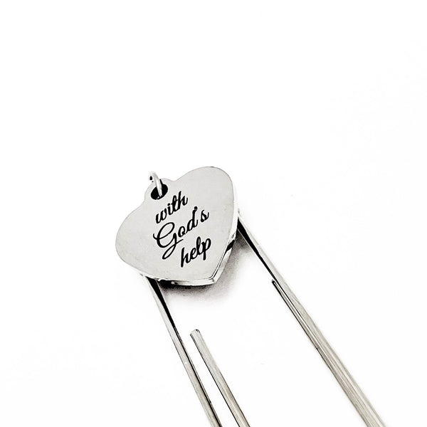 This bookmark has a stainless steel laser engraved charm with “with God’s help” on it.