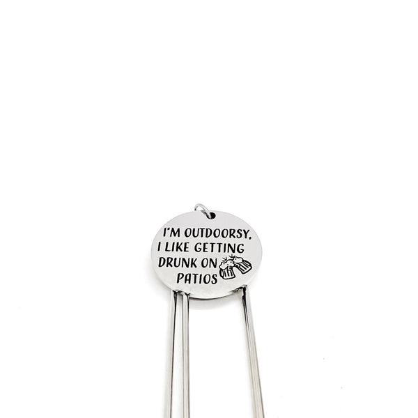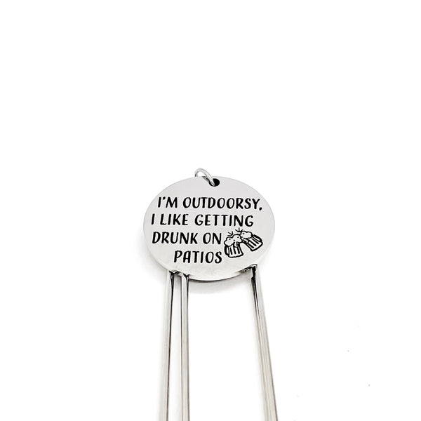 This bookmark has a stainless steel laser engraved charm that has “I’m outdoorsy, I like getting drunk on patios” on it. The charm measures approx. 1 inch across.