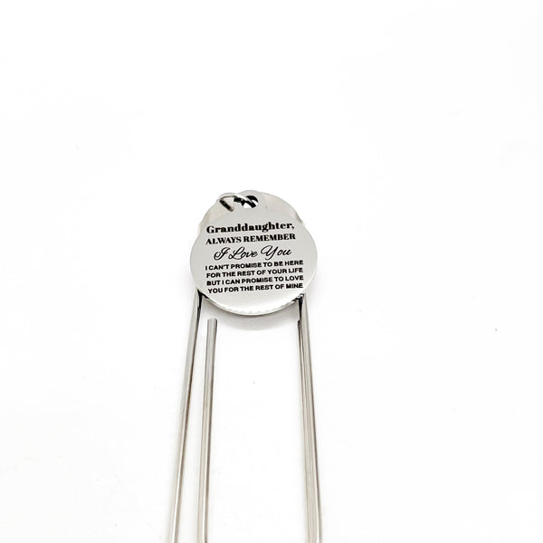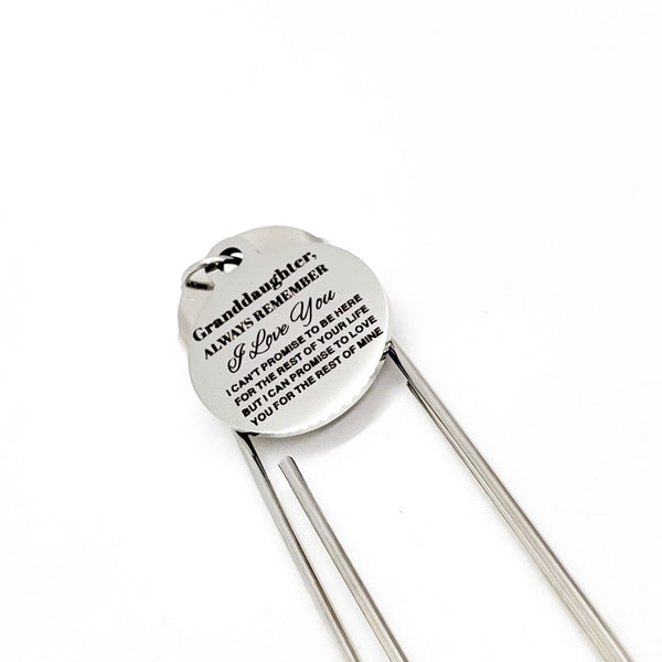 This is a great bookmark. This paper clip bookmark has a stainless steel laser engraved charm with “Granddaughter, Always remember I Love You I can’t promise to be here for the rest of your life but I can promise to love you for the rest of mine” on it. It can be used as a bookmark, page marker, or planner book mark.