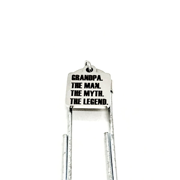 This bookmark has a stainless steel laser engraved charm with "Grandpa. The Man. The Myth. The Legend.” on it. It can be used as a bookmark, page marker, or planner book mark. It would be a great way to celebrate your Grandpa, or to announce to your dad that he is going to be a Grandpa!