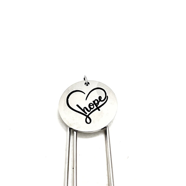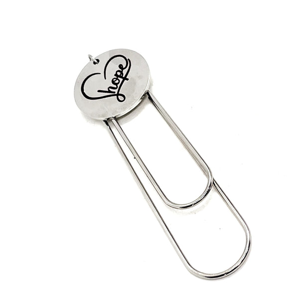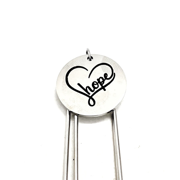 This bookmark has a stainless steel laser engraved charm with “Hope” in a heart image on it.