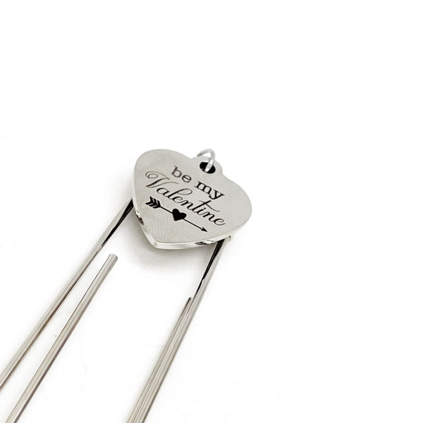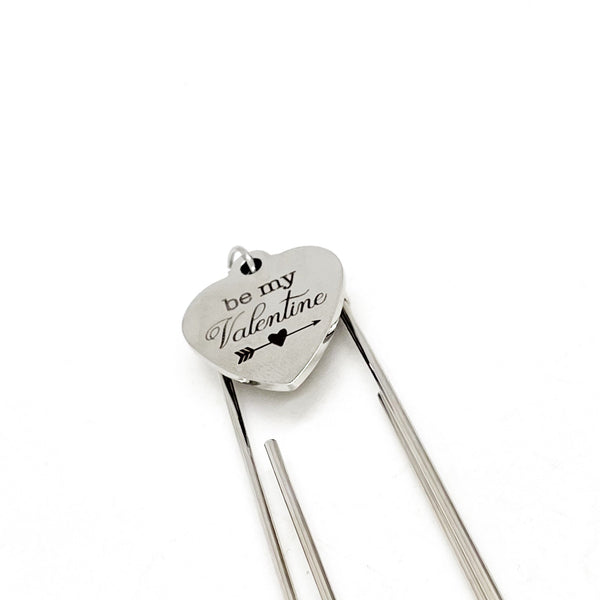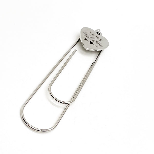 This is a great large paper clip style bookmark that has a stainless steel laser engraved charm with "Be my Valentine" on it. It can be used as a bookmark, page marker, or planner book mark.