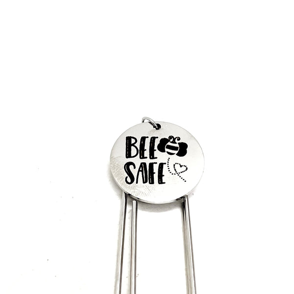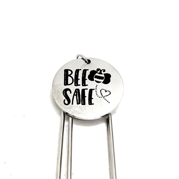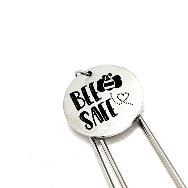 This bookmark has a stainless steel laser engraved charm with “Bee Safe” with a bee image on it.