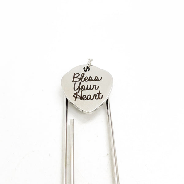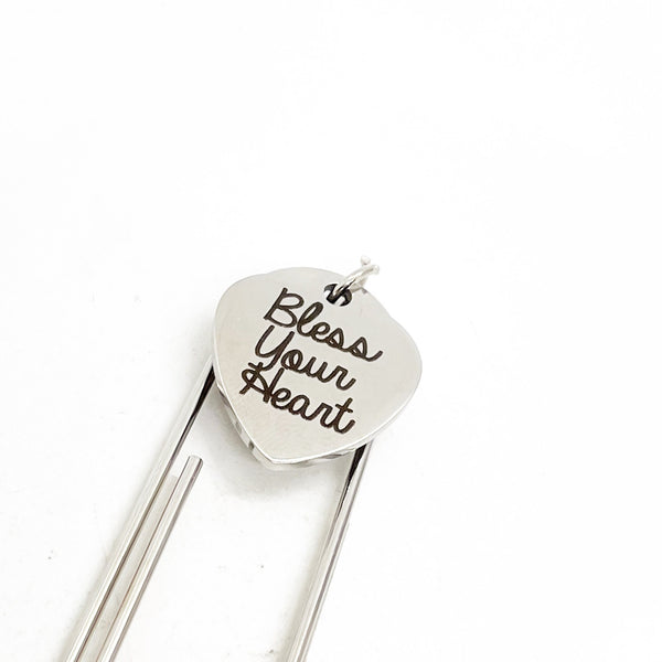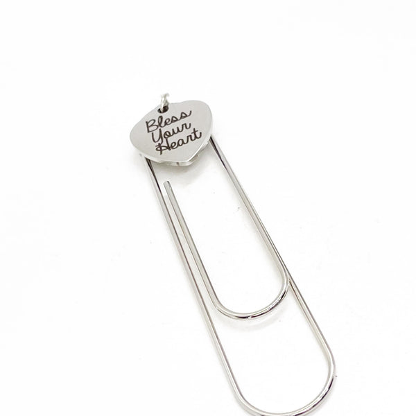 This is a great large paper clip style bookmark that has a stainless steel laser engraved charm with “Bless your heart" on it. It can be used as a bookmark, page marker, or planner book mark.