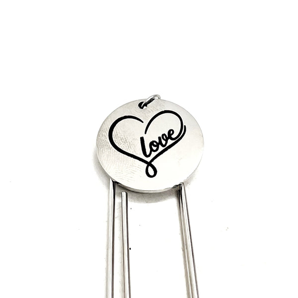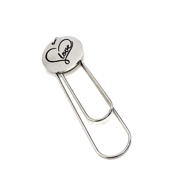 This bookmark has a stainless steel laser engraved charm with “Love” in a heart image on it.