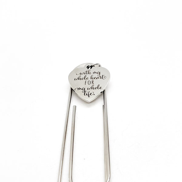 This is a great large paper clip style bookmark that has a stainless steel laser engraved charm with "With my whole heart for my whole life" on it. It can be used as a bookmark, page marker, or planner book mark.