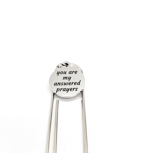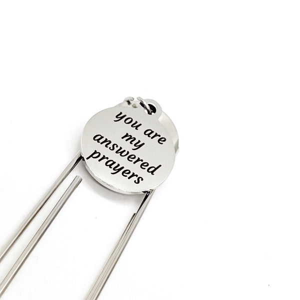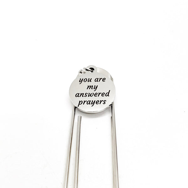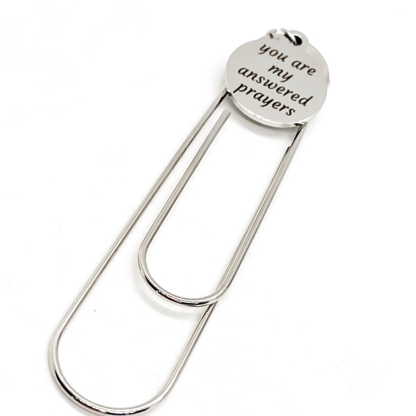 This is a great bookmark. This paper clip bookmark has a stainless steel laser engraved charm with “You are my answered prayers” on it. It can be used as a bookmark, page marker, or planner book mark.