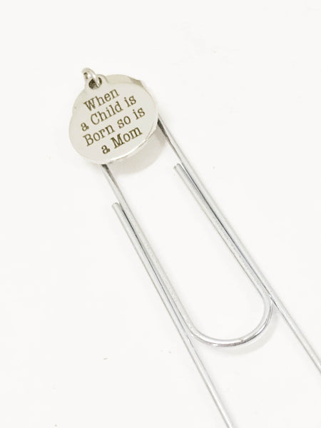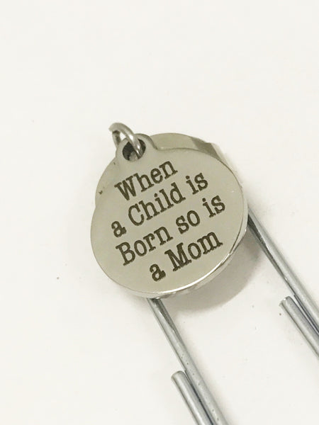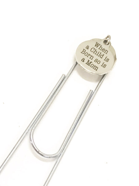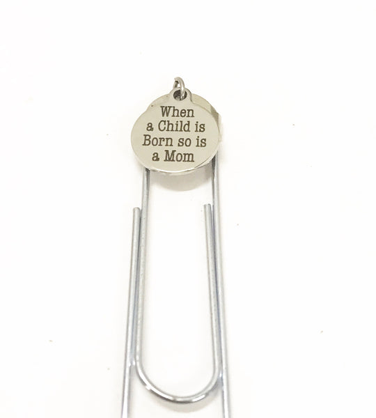 This is a great new mom gift bookmark. This paper clip bookmark has a stainless steel laser engraved charm with "When a child is born so is a mom" on it. It can be used as a Bible bookmark, page marker, or planner book mark.