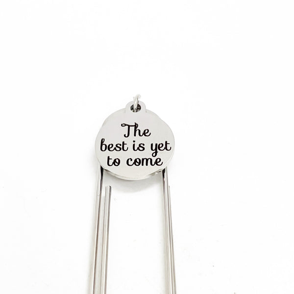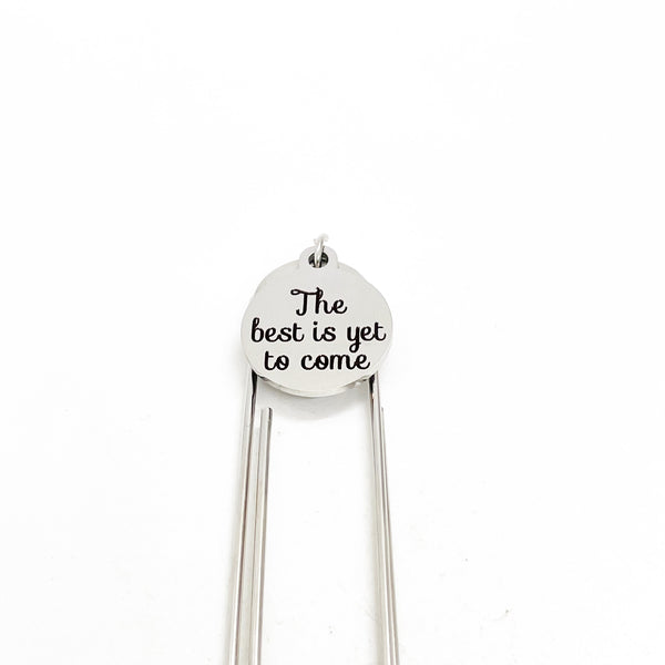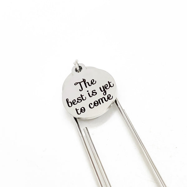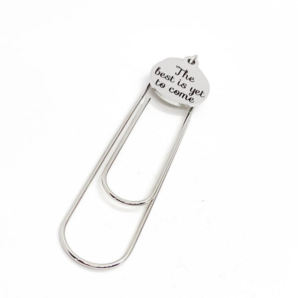 This is a great large paper clip style bookmark that has a stainless steel laser engraved charm with “The best is yet to come" on it. It can be used as a bookmark, page marker, or planner book mark.