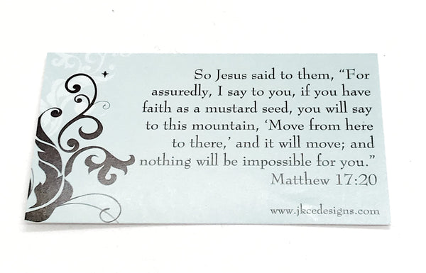 Each book mark comes individually boxed and ready to be given as a gift. A card with the Bible verse of Matthew 17:20 is included.