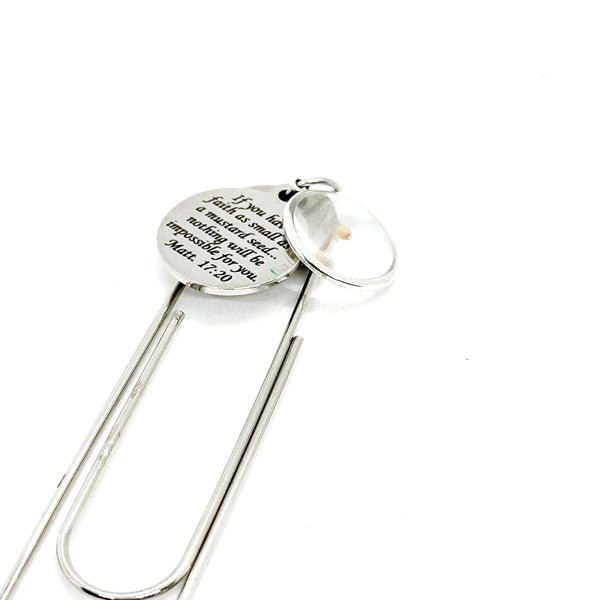 This bookmark has a stainless steel laser engraved charm with the Bible verse of Matthew 17:20 on it and a single mustard seed charm. It can be used as a bookmark, page marker, or planner book mark. The engraved charm measures approx. 3/4 inch across and the bookmark measures approx. 3 1/2 Inches in length.