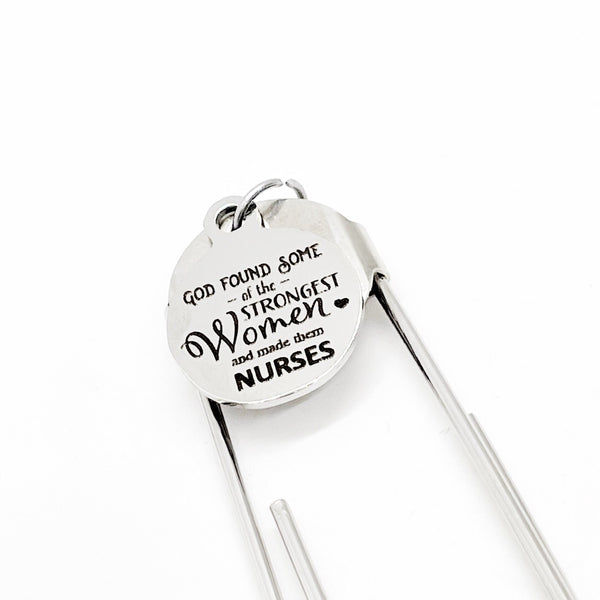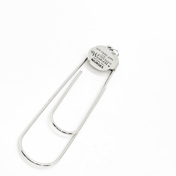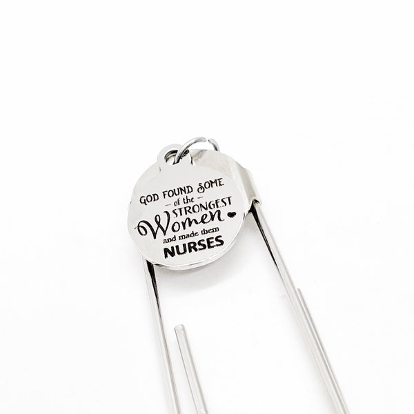 This bookmark has a stainless steel laser engraved charm with “God found some of the strongest women and made them Nurses” on it.