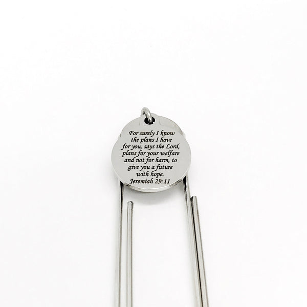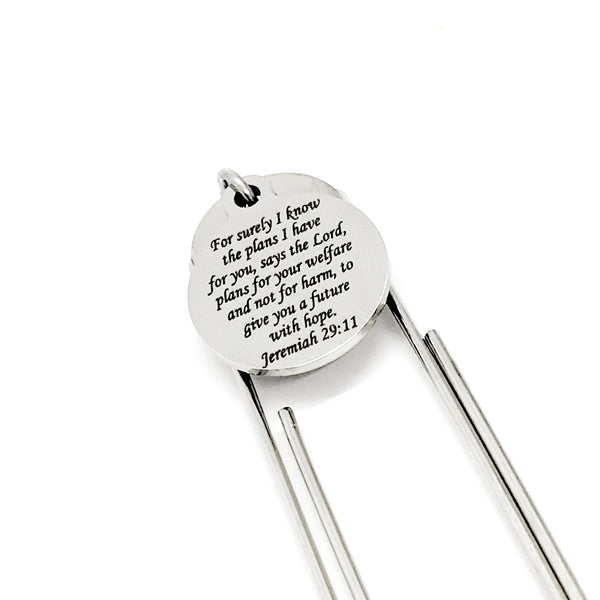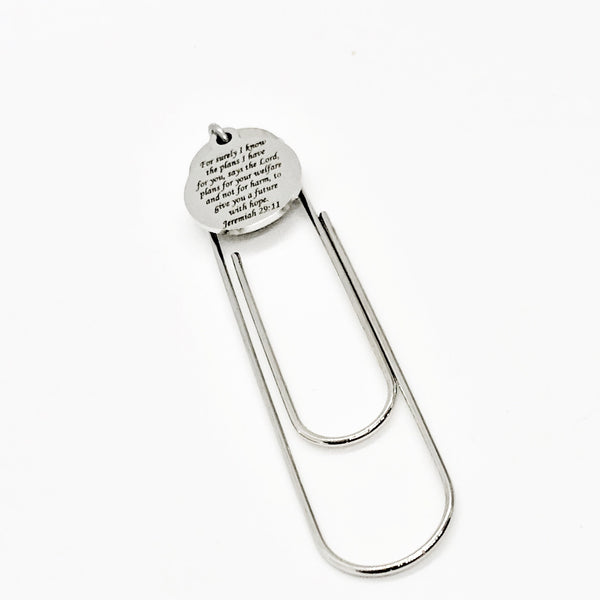 This bookmark has a stainless steel laser engraved charm with “For surely I know the plans I have for you, says the Lord, plans for your welfare and not for harm, to give you a future with hope” from Proverbs 29:11 on it. It can be used as a bookmark, page marker, or planner book mark.