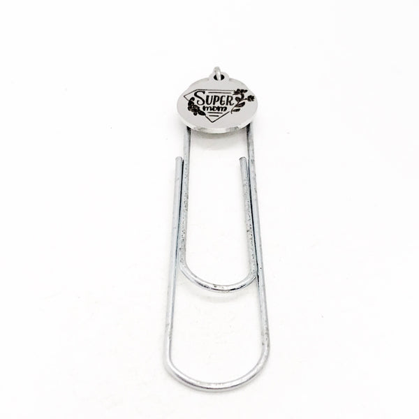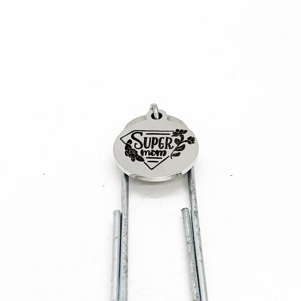 This bookmark has stainless steel laser engraved charm that says, “Super Mom” on it. This charm measures approx. 3/4 inch across.