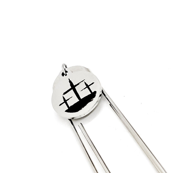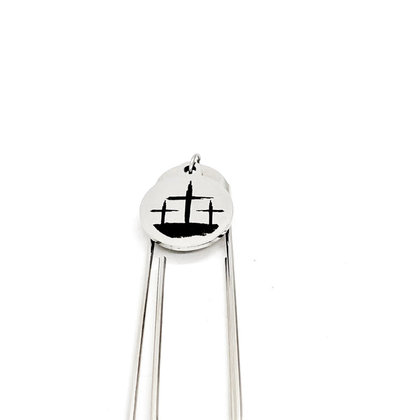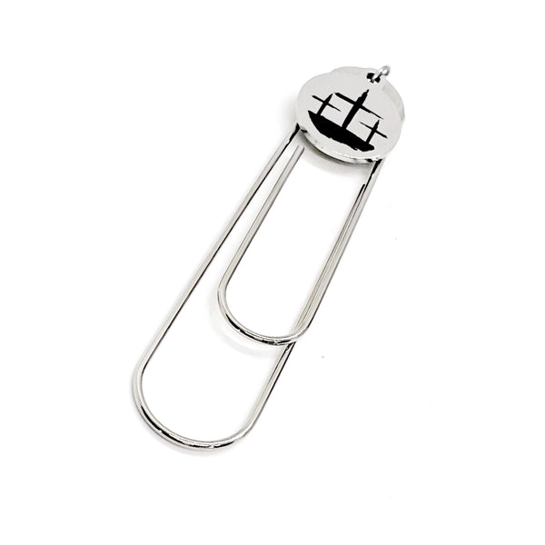 This bookmark has a stainless steel laser engraved charm that has 3 crosses on it. The charm measures approx. 3/4 inch across.
