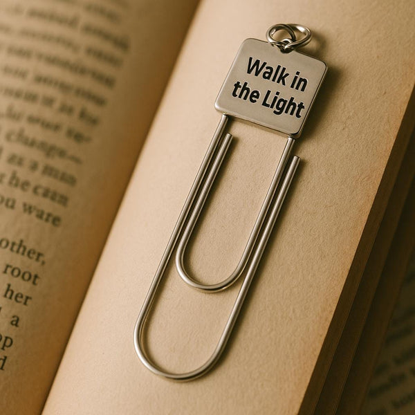 Keep your place and your faith close with this stainless steel paperclip bookmark from JKCE Designs. Featuring a 19mm engraved charm that reads “Walk in the Light,” this 3½-inch bookmark is a perfect blend of function and inspiration. Crafted from durable stainless steel with a polished finish, it’s ideal for marking your favorite Bible verse, devotional, or daily journal page. A meaningful and elegant faith-based gift for readers, church friends, or loved ones seeking encouragement.