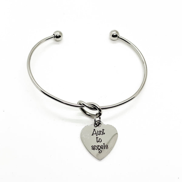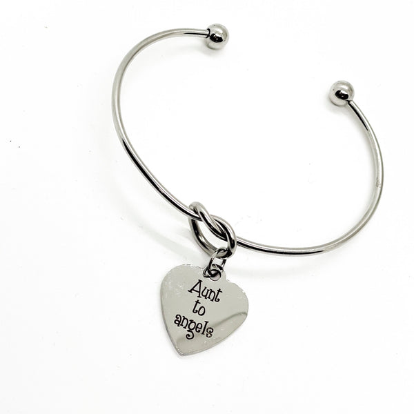 This is a beautiful knotted stainless steel cuff bracelet with an engraved charm with “Aunt to Angels” on it.