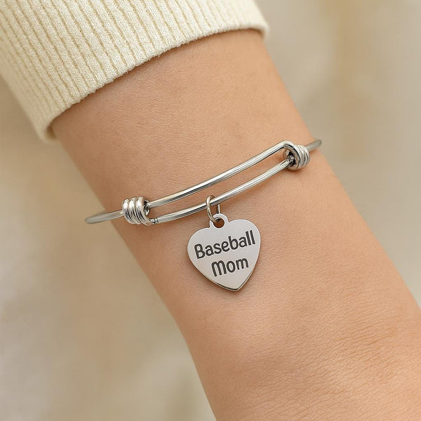 Celebrate your favorite title—Baseball Mom—with this stylish stainless steel charm bracelet. Featuring a 19mm heart-shaped charm engraved with "Baseball Mom," this durable, adjustable bangle is a must-have for sports moms who love cheering from the stands. The sleek design makes it perfect for everyday wear or game day pride. A thoughtful gift for Mother's Day, team events, or just because.