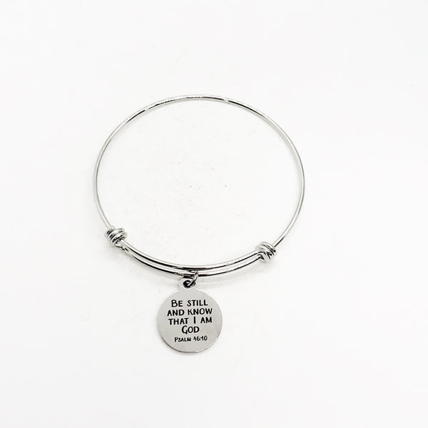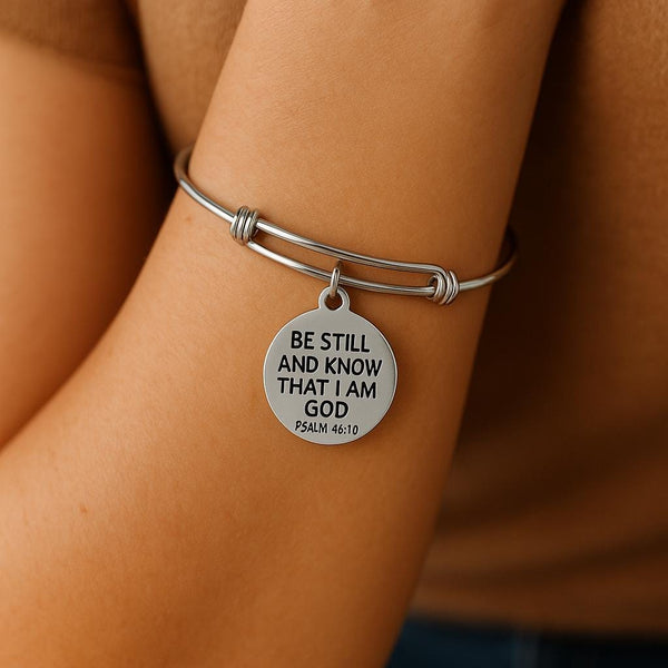Embrace peace and faith with this elegant stainless steel expanding bangle bracelet from JKCE Designs. The bracelet features a beautifully engraved 19mm charm that reads “Be still and know that I am God – Psalm 46:10.” Crafted from durable stainless steel, it’s both hypoallergenic and tarnish-resistant, ensuring lasting shine and meaning. Its adjustable design provides a comfortable fit for most wrist sizes, making it a thoughtful Christian gift for birthdays, confirmations, baptisms, or daily encouragement. A perfect reminder to pause, trust, and rest in His presence.