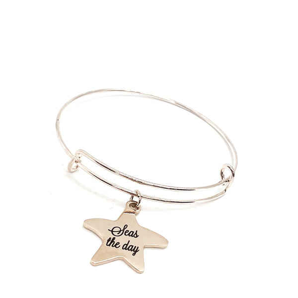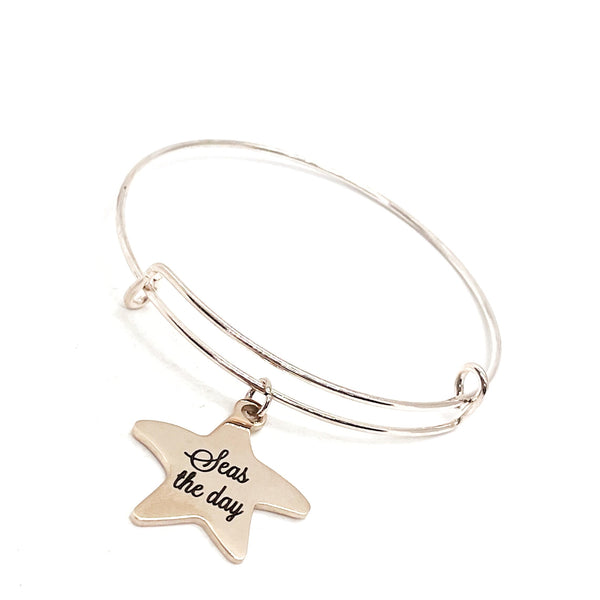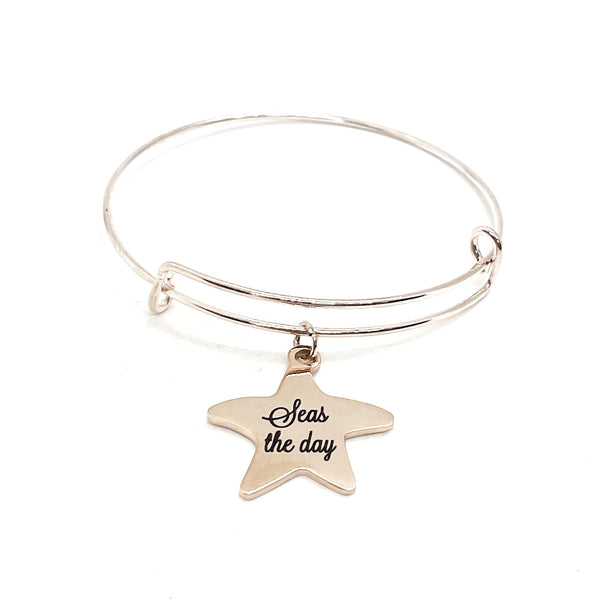 This stacking bangle charm bracelet jewelry gift would be a great gift for a beach lover or girls weekend trip. It has a rose gold stainless steel laser engraved charm with “Seas the day” on it.
