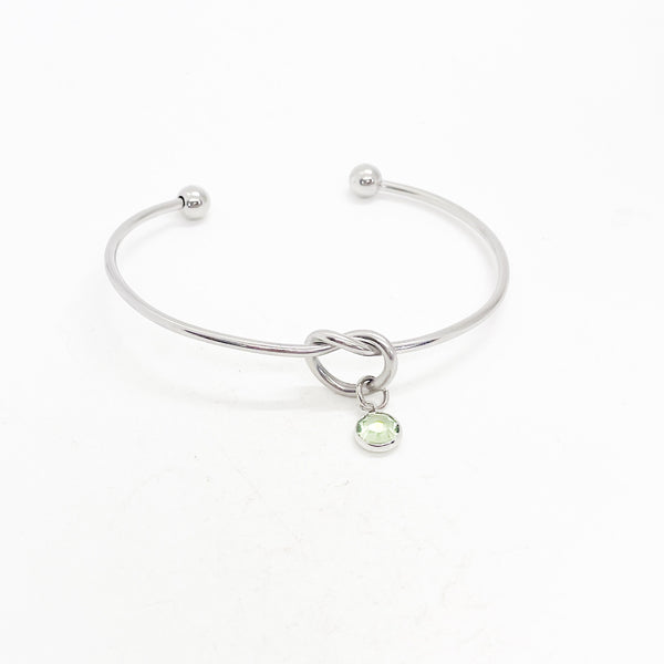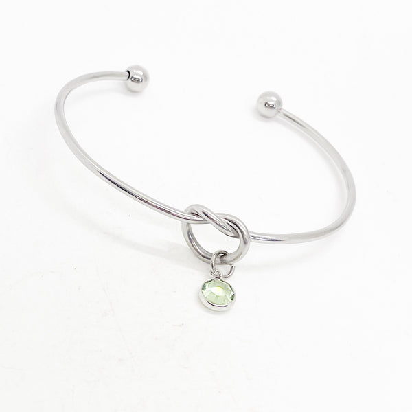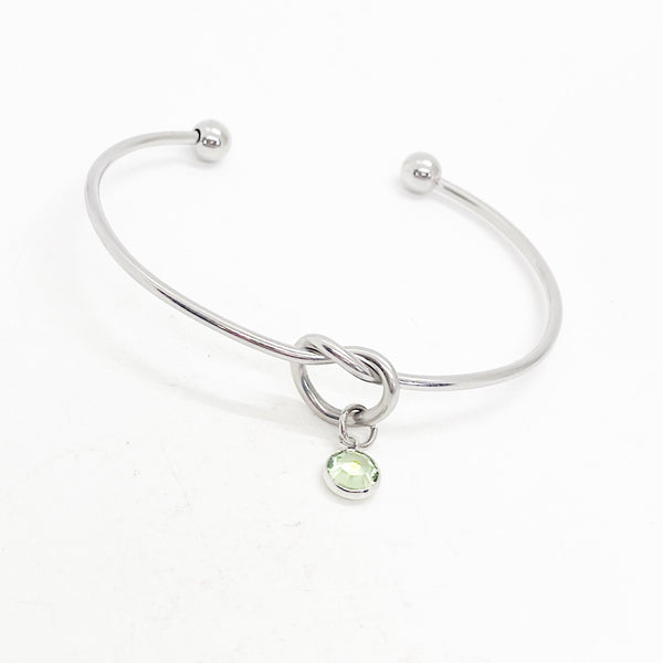 This is a beautiful knotted stainless steel cuff bracelet with a birthstone crystal on it.