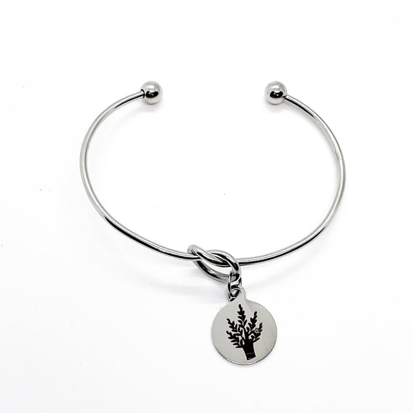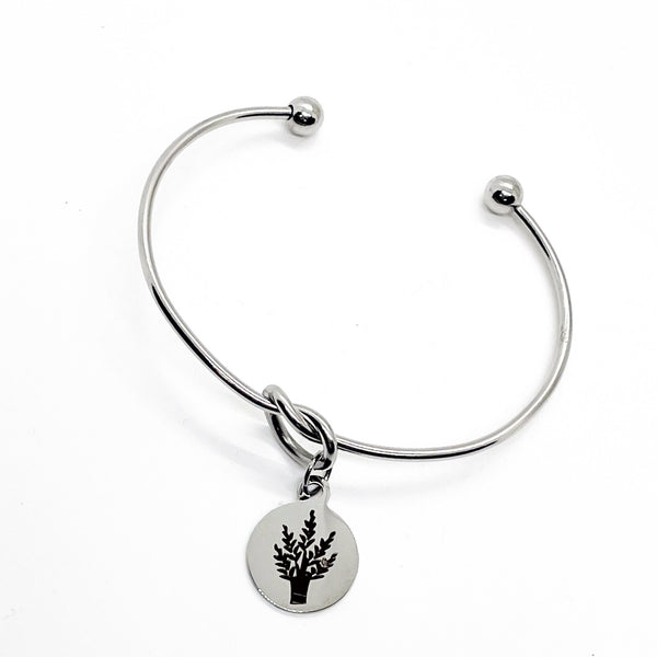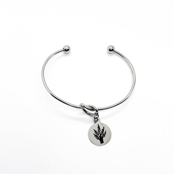 This is a beautiful knotted stainless steel cuff bracelet with an engraved charm with a image of wheat, which is a symbol of prosperity and blessing, on it.