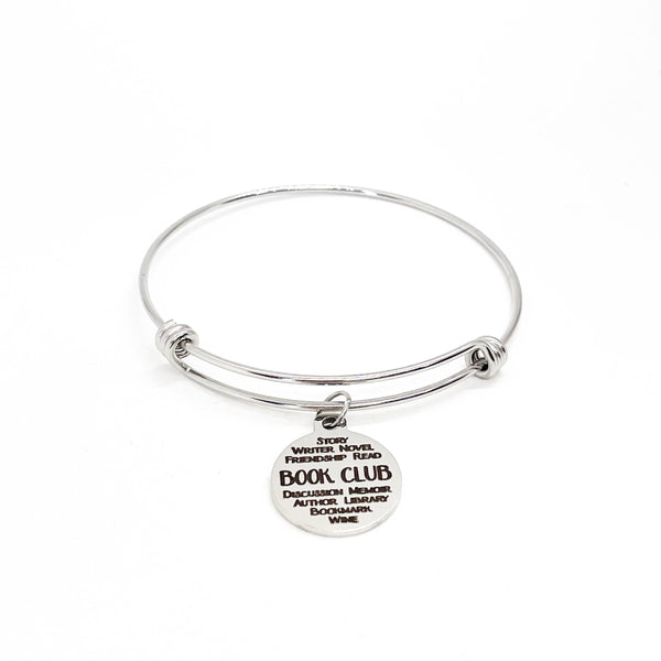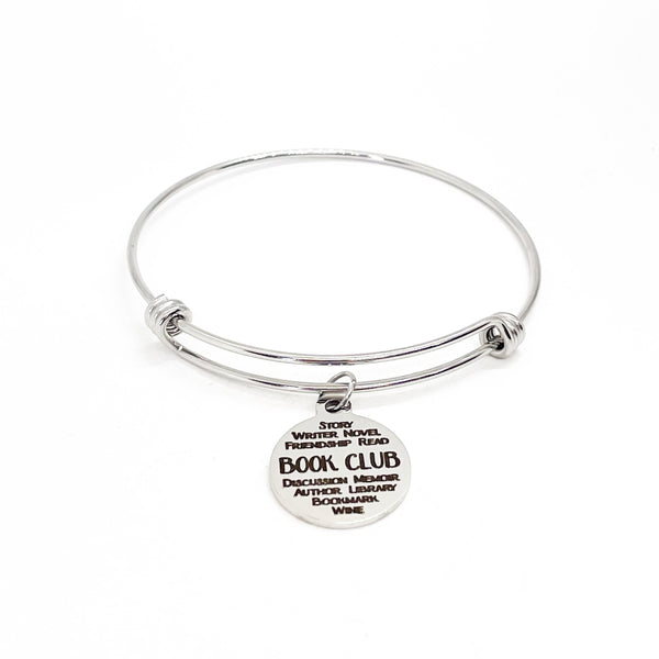 This is a beautiful bangle bracelet with a laser engraved stainless steel charm that has Book Club words on it.