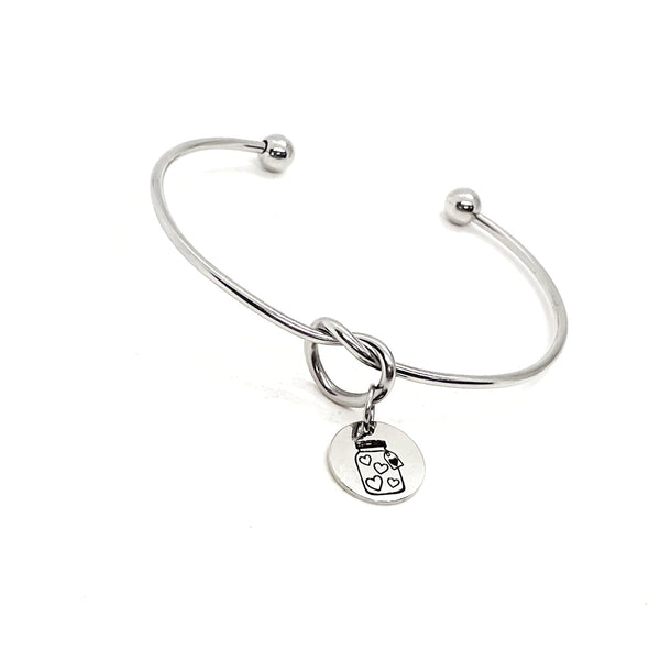 This is a beautiful knotted stainless steel cuff bracelet with an engraved charm with a canning jar full of hearts on it.