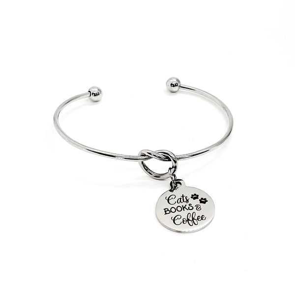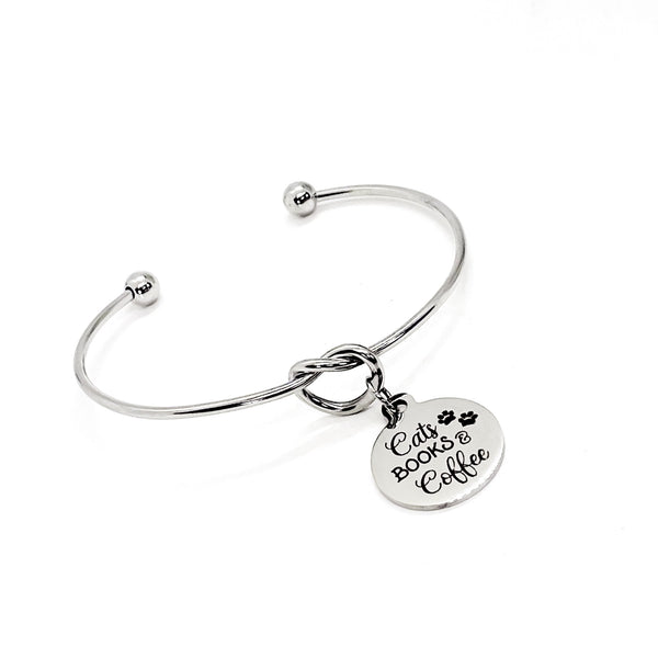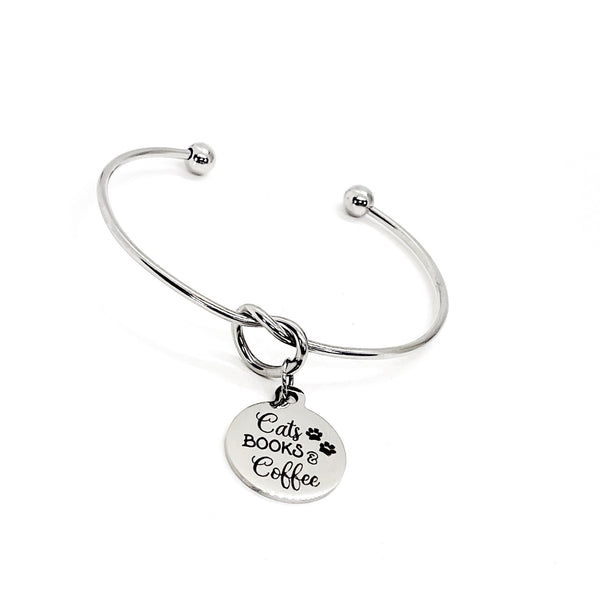 This is a beautiful knotted stainless steel cuff bracelet with an engraved charm with “Cats Books Coffee” on it.