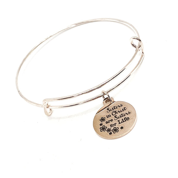 This stacking bangle charm bracelet jewelry gift would be a great baptism gift or gift for a Christian women’s bible study group. It has a rose gold stainless steel laser engraved charm with “Sisters in Christ are sisters for life” on it.