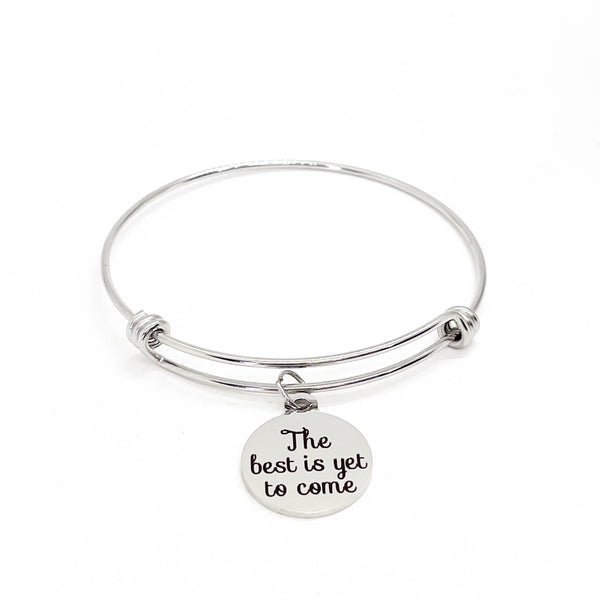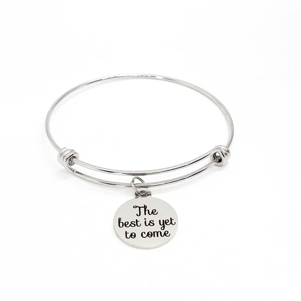 This is a beautiful bangle bracelet with a laser engraved stainless steel charm that has “The best is yet to come” on it.