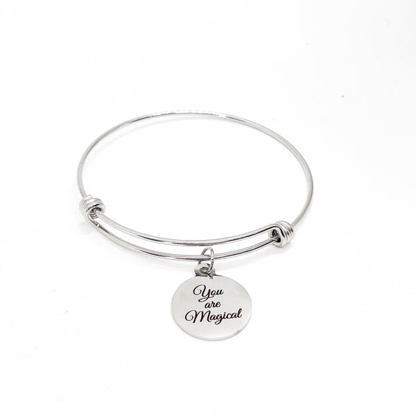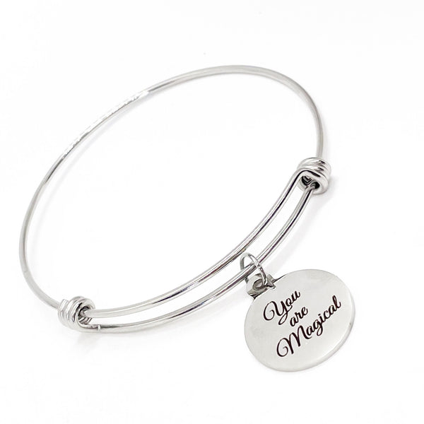 This is a beautiful bangle bracelet with a laser engraved stainless steel charm that has “You are Magical” on it.