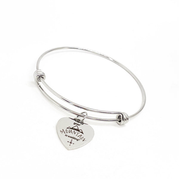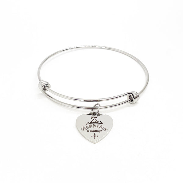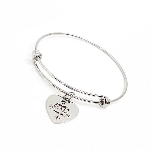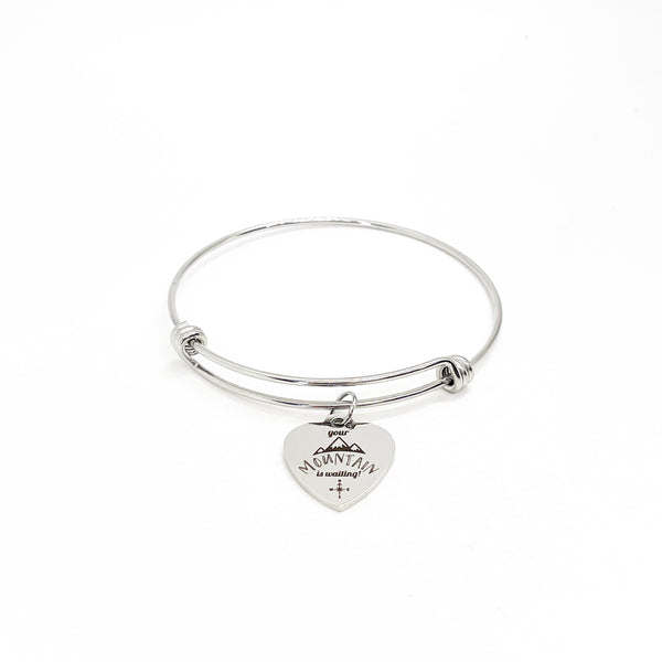 This is a beautiful bangle bracelet with a laser engraved stainless steel charm that has “Your mountain is waiting” on it.